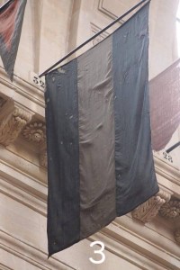 Otro detalle de estas banderas no tenían las leyendas federales y algunas de ellas tampoco los cuatro gorros frigios en los cuatro ángulos de las enseñas. De esas cinco banderas, exhibidas y muy mal conservadas durante muchos años, la detallada anteriormente fue devuelta en marzo de 1997 y está depositada en el Museo Histórico Nacional, y dos aparentemente fueron perdidas durante la ocupación de París durante la segunda guerra mundial a manos de dos soldados alemanes que custodiaban el lugar y que se las llevaron como souvenirs, cuyas identidades no fueron reveladas por las autoridades francesas y fueron dadas de baja en el inventario del Museo francés. Quedaron entonces dos banderas de las cuales una se destruyó por el paso del tiempo y falta de mantenimiento y otra bandera argentina sin sol ni gorros frigios en los ángulos ni leyendas, esta actualmente colgada de la nave central de la capilla de St. Louis”.